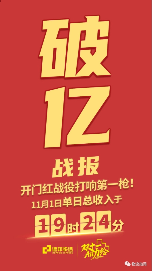 11月1日零点10分,由德邦快递承运的双十一大件快递第一单便成功送达,仅用时10分钟,刷新了双十一大件快递首单记录!19时24分,德邦快递单日总收入破亿。